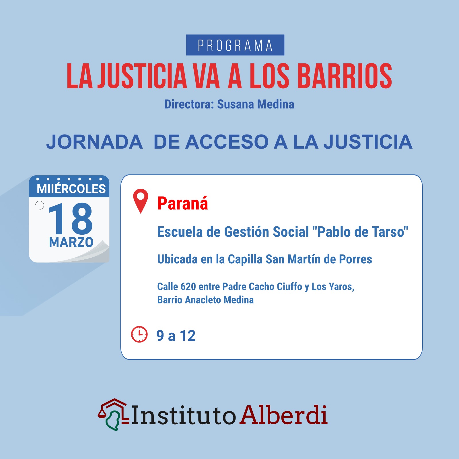 Este miércoles se realizará en Paraná la primera jornada del año del programa “La Justicia va a los Barrios”. La actividad tendrá lugar de 9 a 12 en la “Escuela de Gestión Social Pablo de Tarso”, ubicada en la Capilla “San Martín de Porres” (calle 620 entre Padre Cacho Ciuffo y Los Yaros), en barrio Anacleto Medina. La jornada será abierta, gratuita y las personas podrán acercarse sin necesidad de pedir turnos. Si el trámite es ante Juzgado de Paz, deberán llevar DNI.
